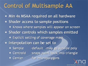 Будут сняты некоторые ограничения, установленные для программистов при переходе в 10-й версии API к универсальным шейдерам. 4х станет минимальным значением для антиалиасинга. Остается надеяться, что в мире найдется достаточно видеокарт, поддерживающих данную функцию. Также улучшится построение структур.